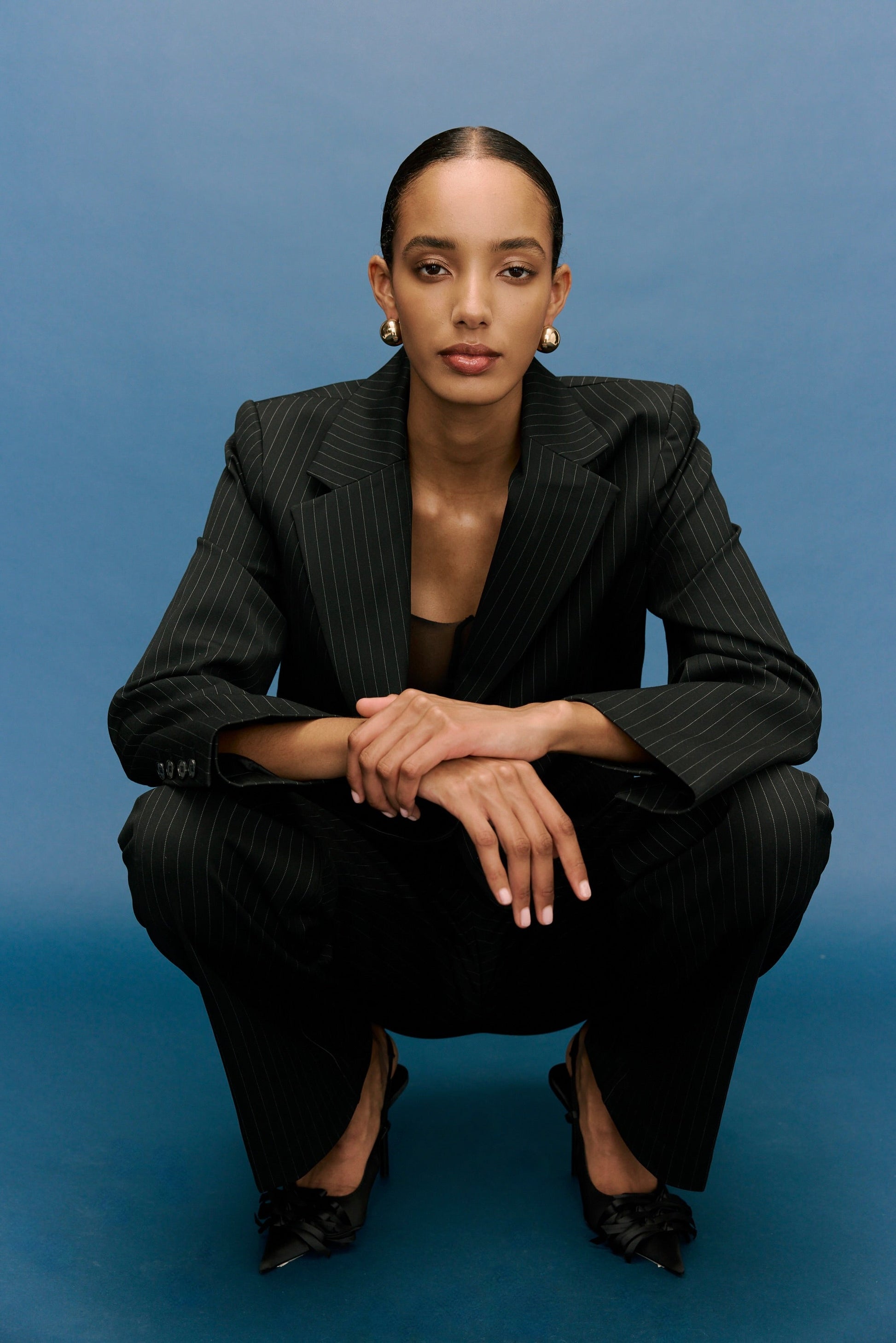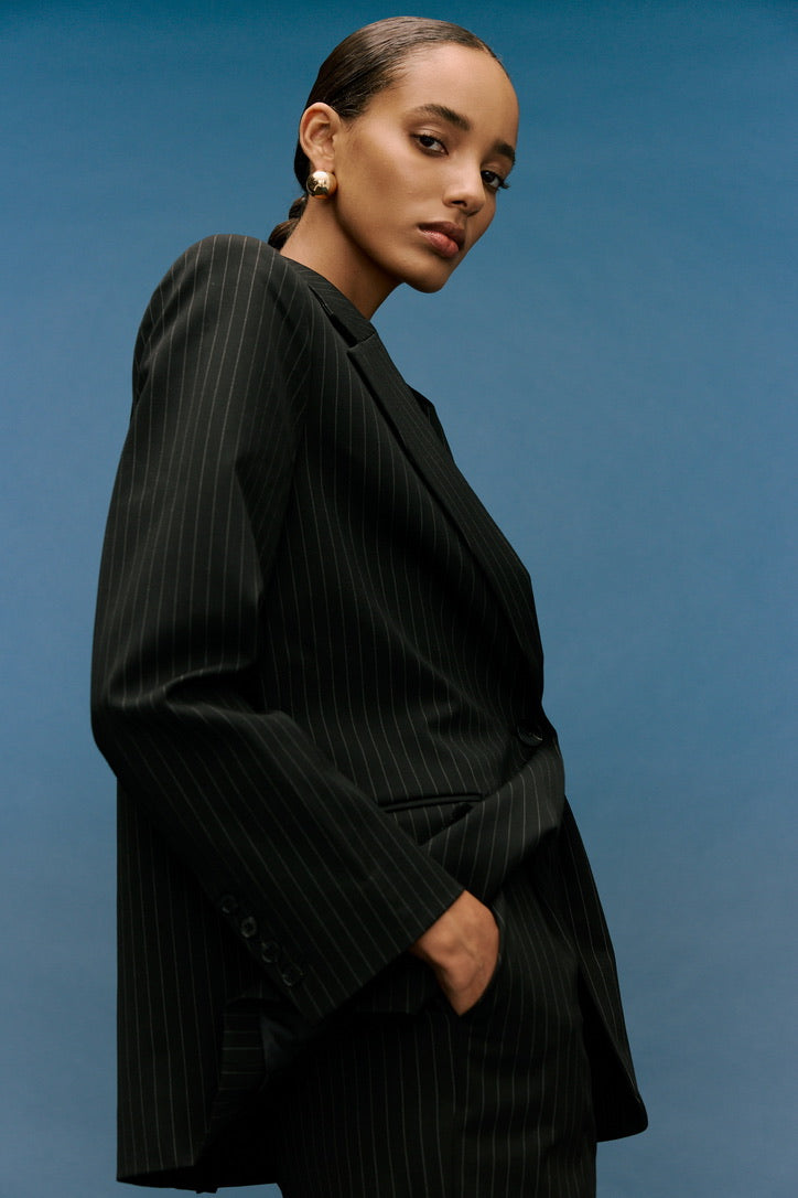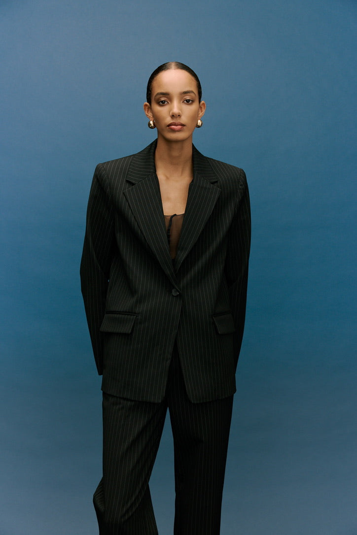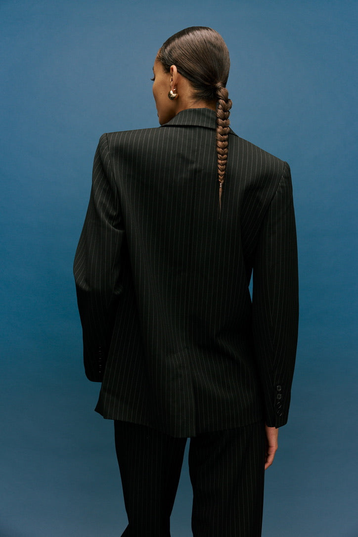 The pinstriped Dani Blazer showcases refined tailoring, embodying timeless elegance in its single breasted style. Featuring impeccable shoulder construction.