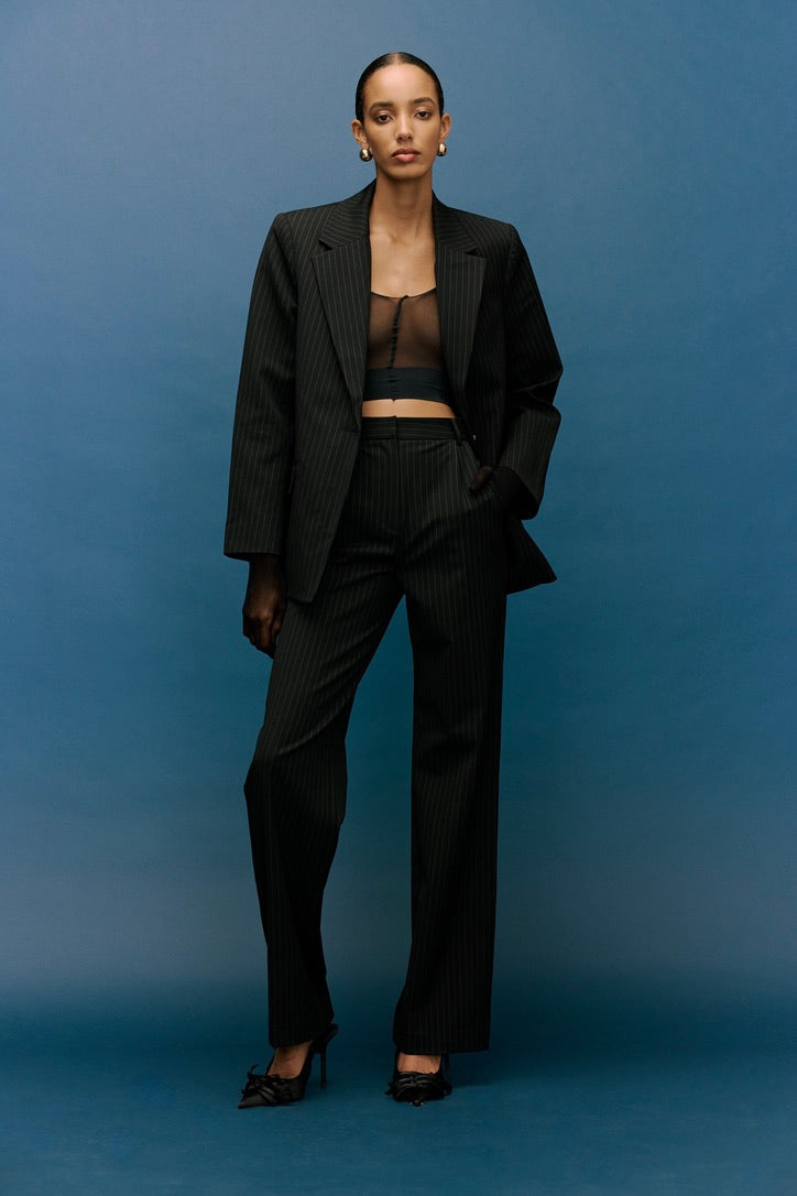 The pinstriped Dani Pant is a mid rise tailored pant. Featuring front pleats and finished with a concealed button, hook and zip fastening at front.
