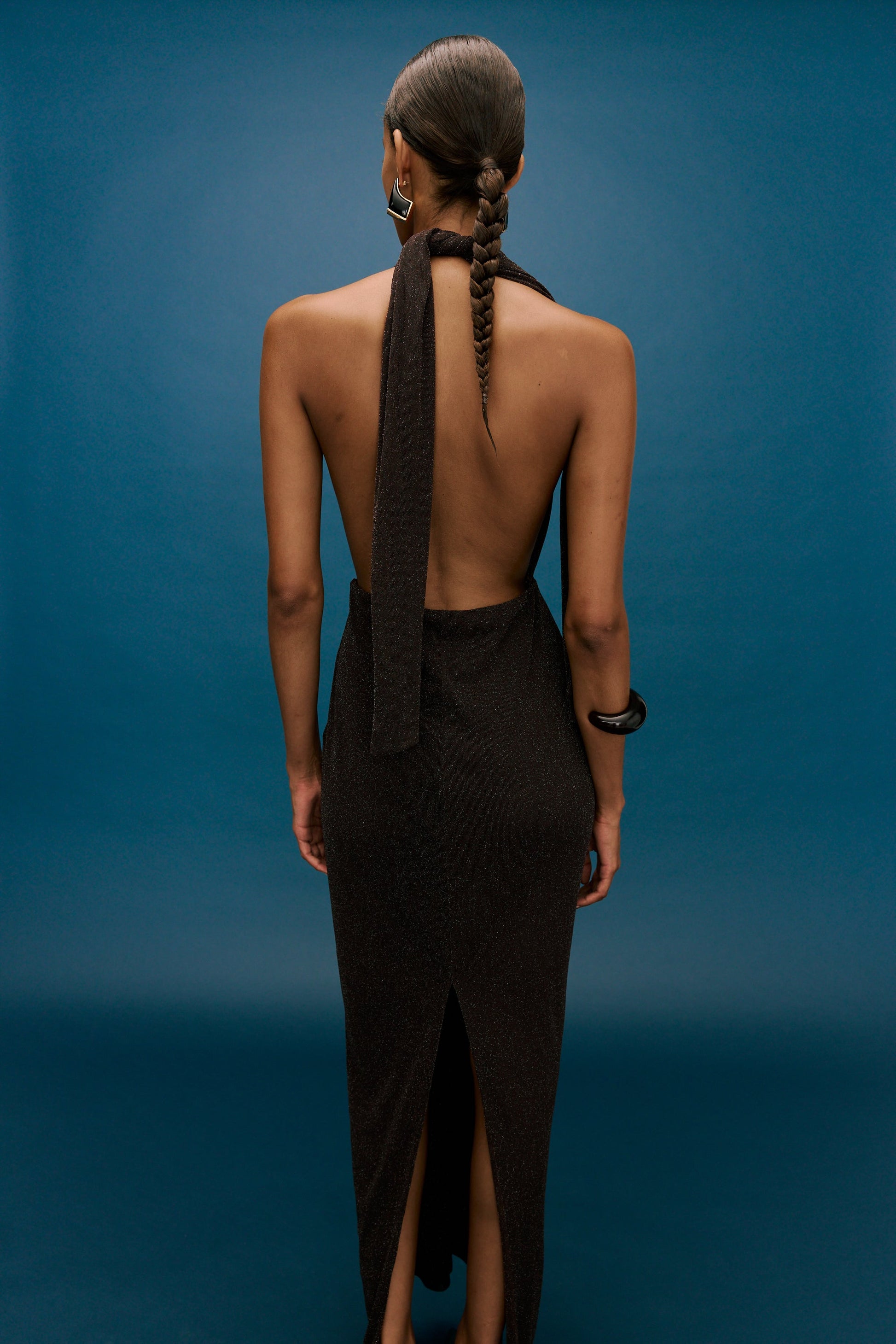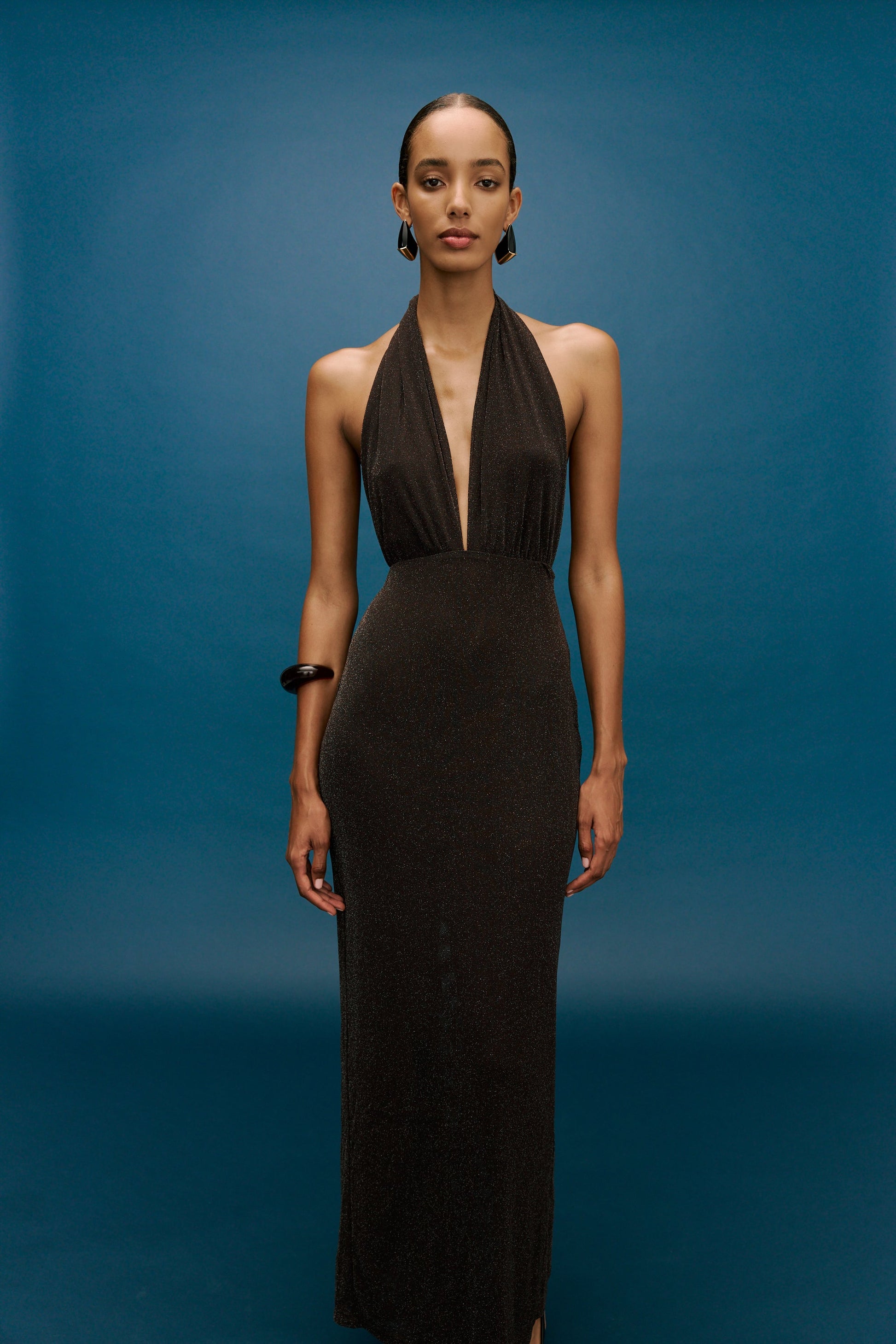 The Lina Dress is crafted from a luxurious stretch lurex fabrication, in a beautiful chocolate colour. This full length design is accentuated by a plunging neckline and adjustable neck tie straps that offer versatility and endless styling options. Featuring a back split and side zipper, and a complimentary slip skirt for added coverage.